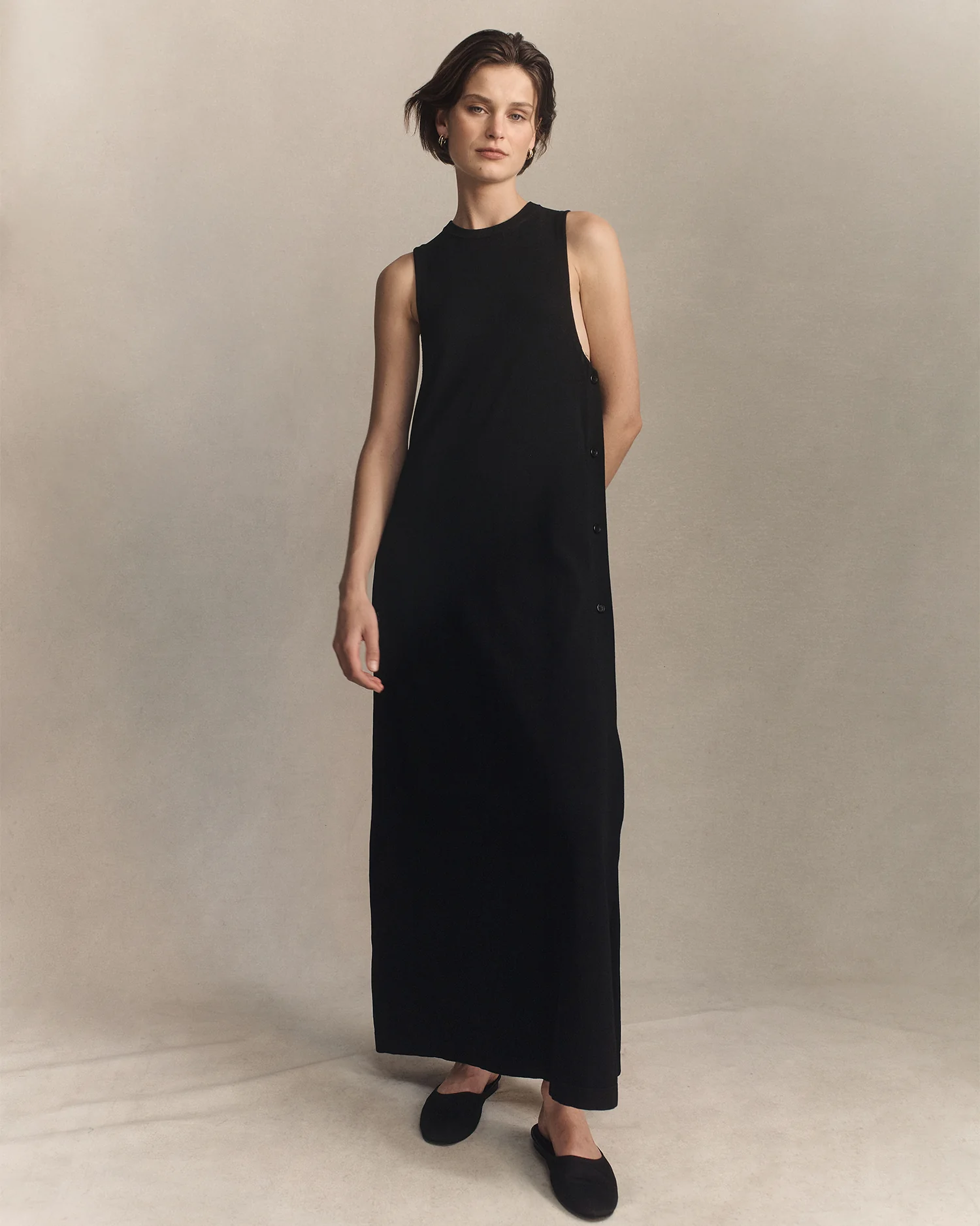 A versatile styling piece crafted in a light-weight viscose crepe knit, with a high neckline and straight silhouette. Full button closure on both sides allows for ease of layering, working equally well as a subtle feature when worn alone.