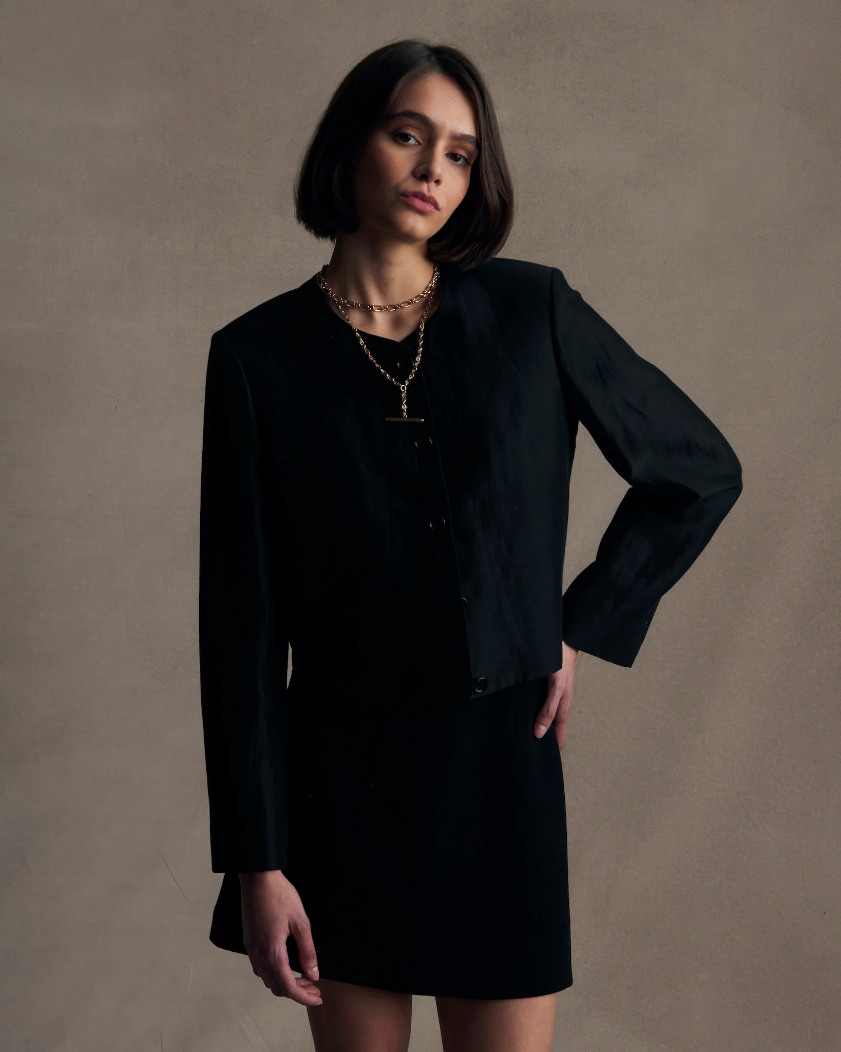 A modern cropped women’s jacket our Corta style is designed to bring soft tailoring into an elevated, contemporary wardrobe. With its clean proportions and refined structure, this piece offers a polished layer for day-to-evening dressing, pairing effortlessly with trousers, skirts or layered over our Chelsea dress.