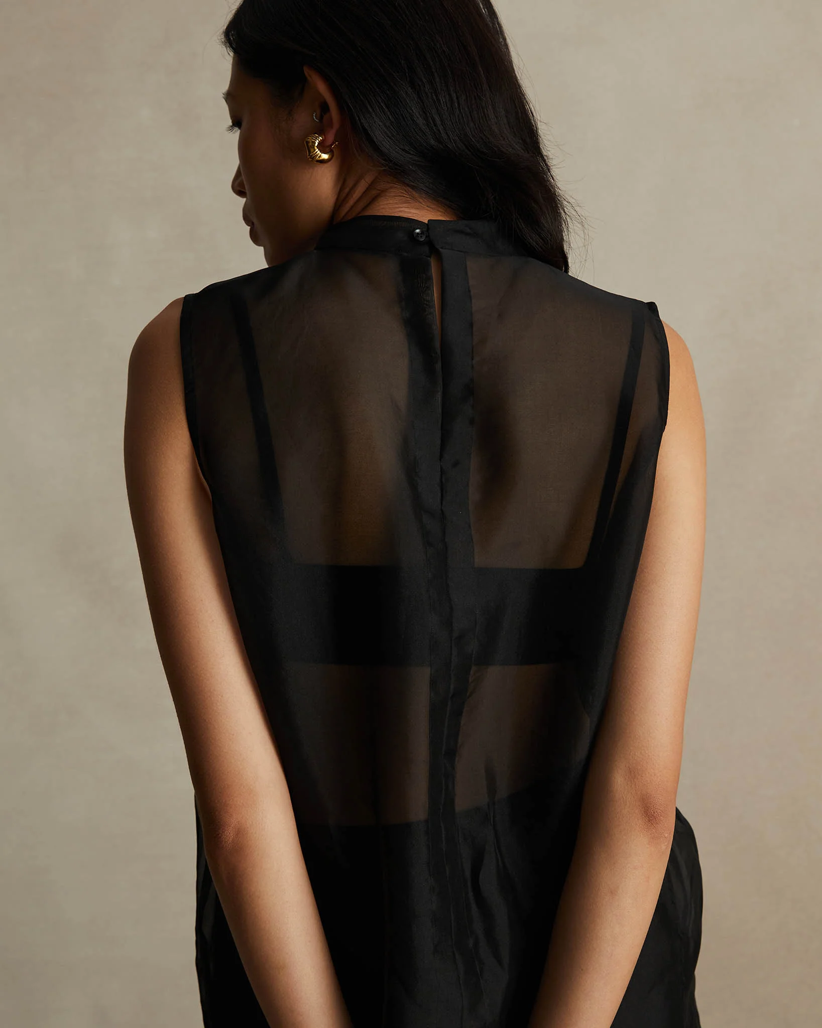 The Organza Devon Top, composed of pure silk, is a timeless and chic take on a streamlined silhouette with the addition of a contemporary sheer element, elevating the look. Sleeveless, with a fitted shape and high mounted neck, this luscious sheer silk shirt is perfectly paired with the Silk Organza Devon Skirt or the Pamela Pant.