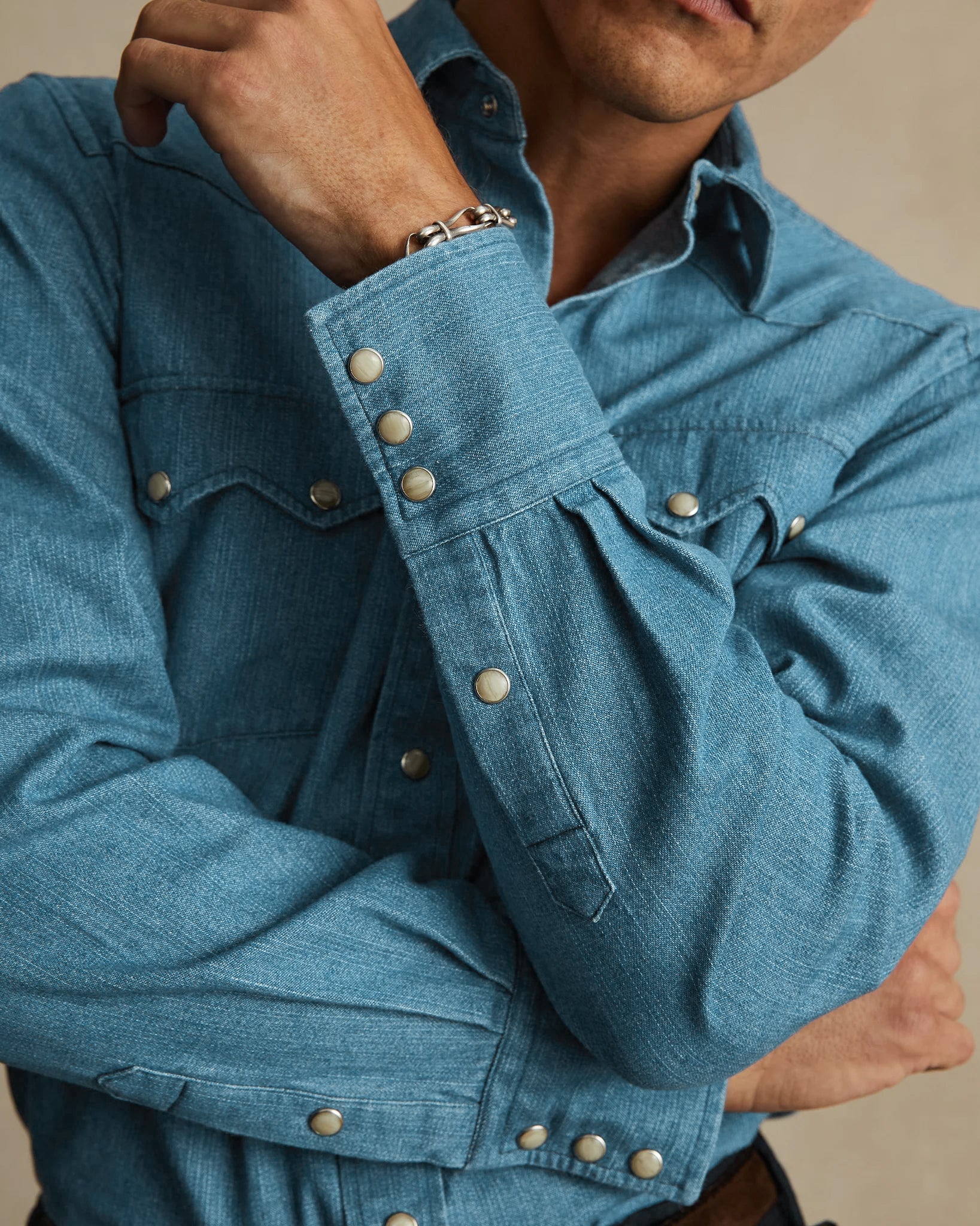 A wardrobe necessity our western shirt carries an easy relaxed fit with subtle nods to the classic. Mother of pearl press studs down the placket make for an intriguing detail when buttoned under a jacket, while the pointed chest pockets and yoke add a bit of flare when worn open as an over shirt.