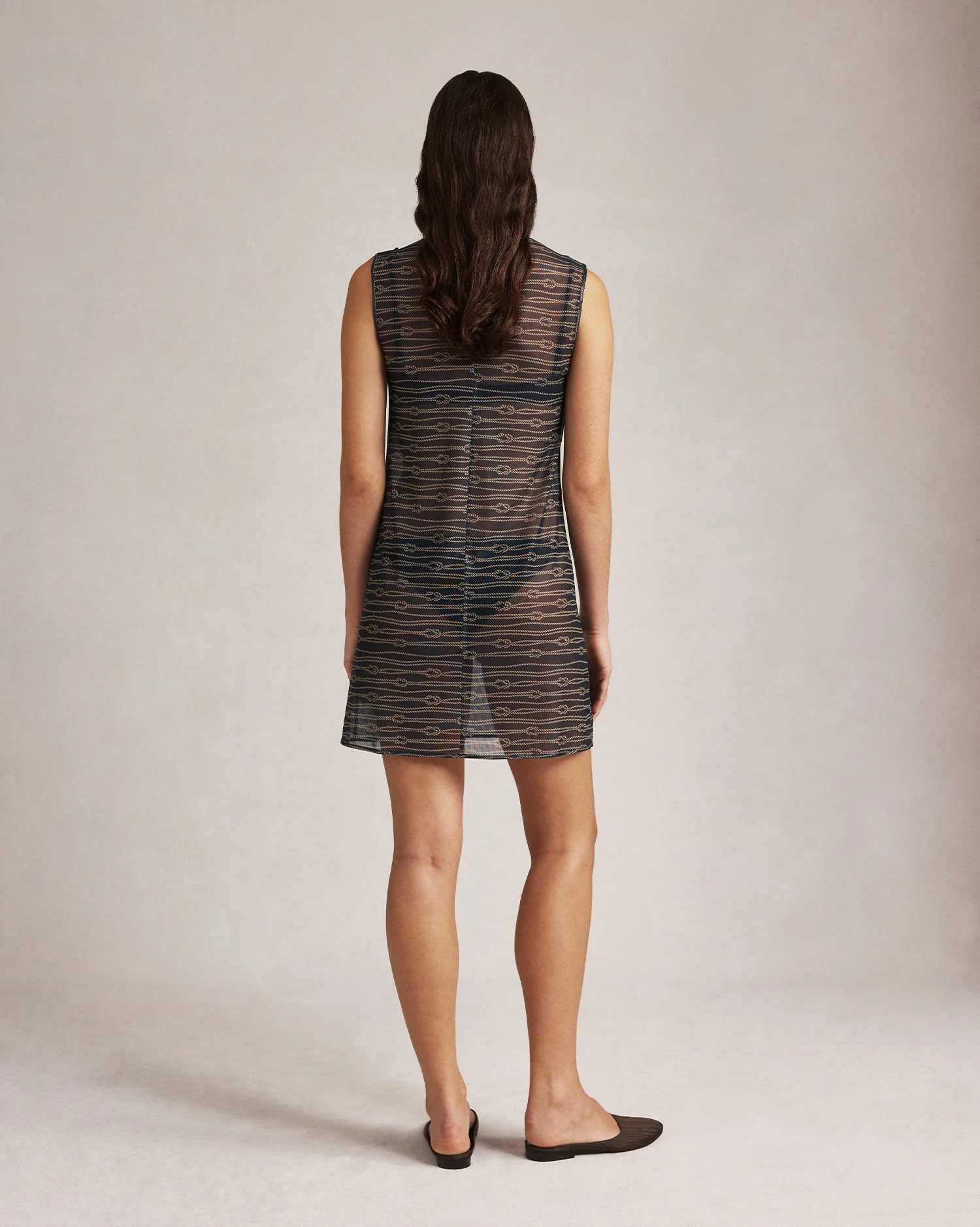 The Tamsin sheer swim overlay dress floats effortlessly in a soft custom graphic mesh, falling in a straight mini shift that hints at the silhouette beneath. A keyhole neckline with mother-of-pearl button adds subtle detail, making this lightweight piece perfect for layering over swimwear or styling as a breezy summer mini.