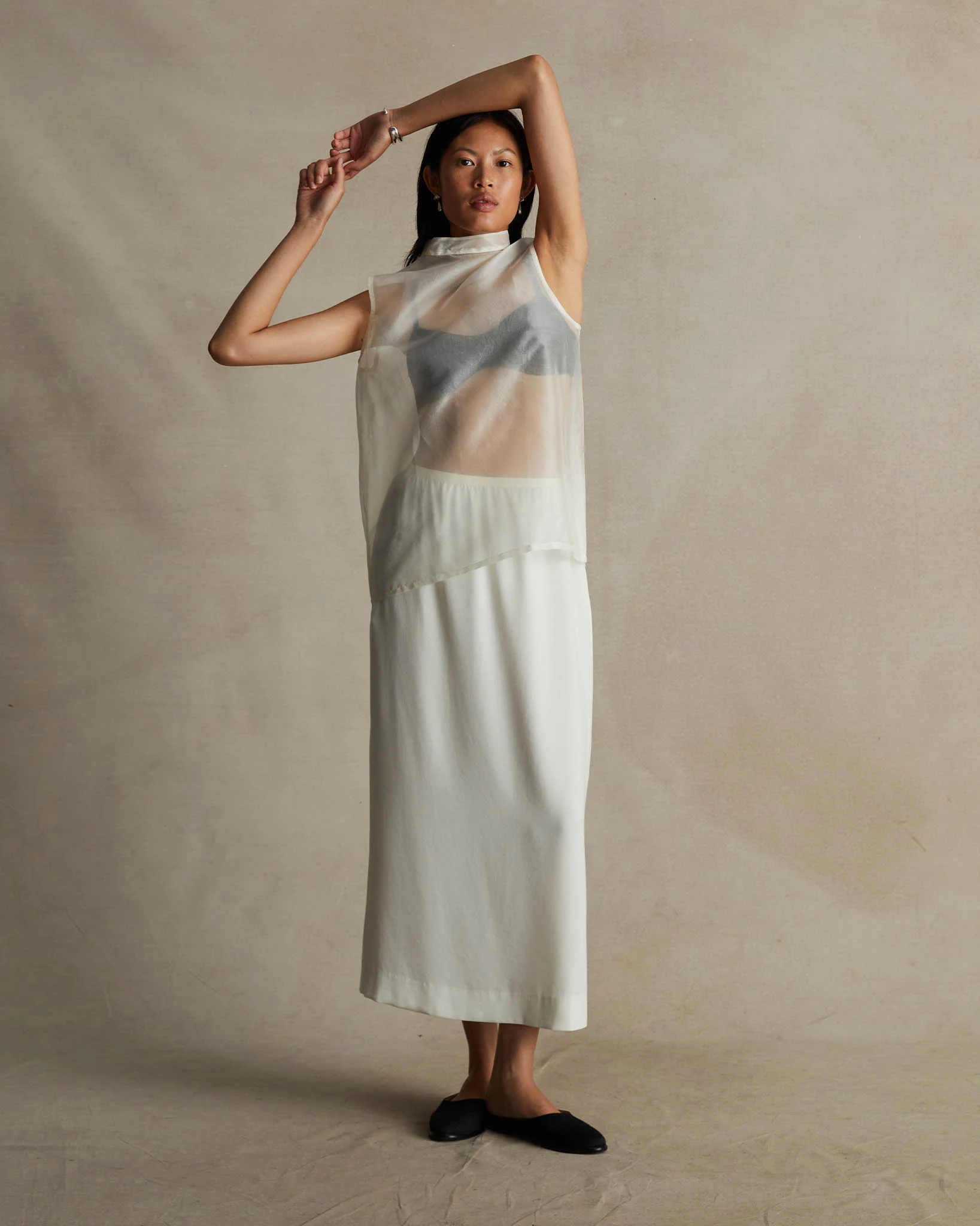 The Organza Devon Top, composed of pure silk, is a timeless and chic take on a streamlined silhouette with the addition of a contemporary sheer element, elevating the look. Sleeveless, with a fitted shape and high mounted neck, this luscious sheer silk shirt is perfectly paired with the Silk Organza Devon Skirt or the Pamela Pant.
